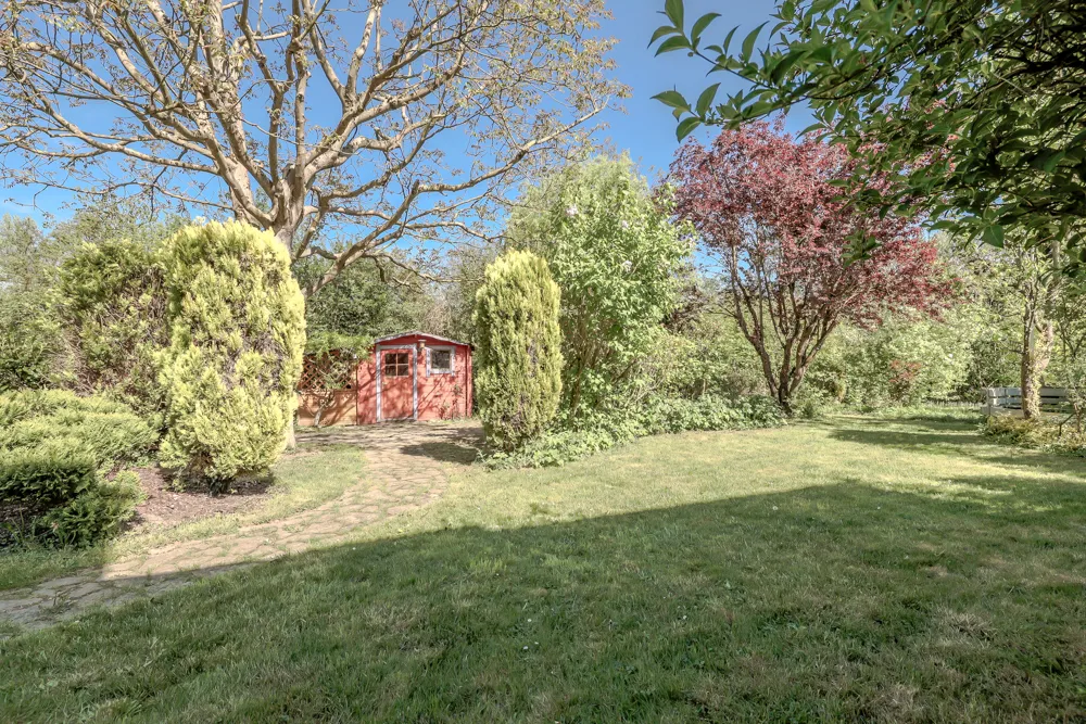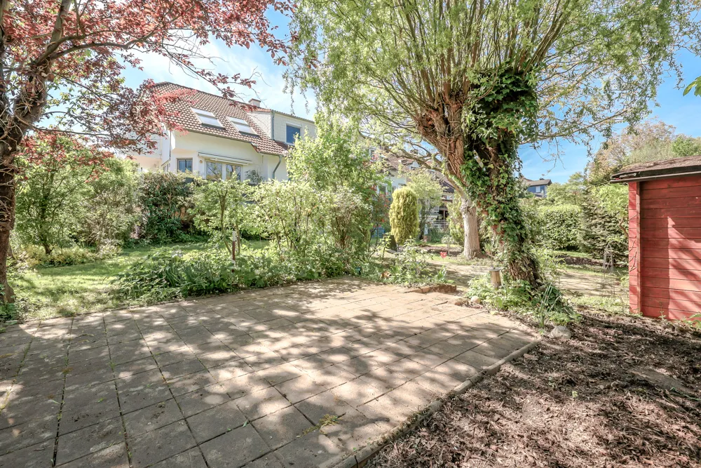 Hier befindet sich ein Gartenhaus, eine Terrasse und viel Baumbestand!