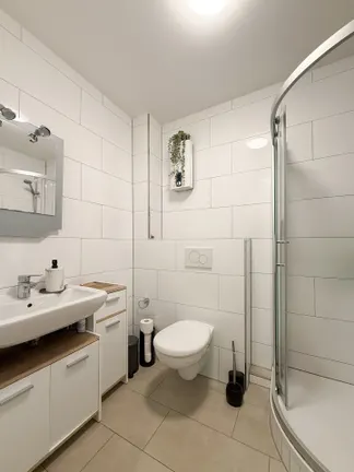 Das moderne Badezimmer ist mit Dusche, Waschbecken und WC ausgestattet. Ein zweites Bad verfügt über Tageslichtfenster, eine Badewanne, WC und Waschbecken.