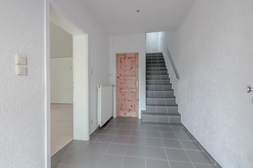 Nach dem Betreten des Hauses gelangt man zunächst in die Diele. Von hier aus führt der Weg geradeaus in den Heizungsraum, der gleichzeitig als Waschküche genutzt wird. In diesem Zusammenhang ist zu beachten, dass der Energieausweis im Jahr 2017 erstellt wurde und anschließend eine neue Heizungsanlage eingebaut wurde. Von der Diele aus erreicht man außerdem über eine Treppe das Obergeschoss. Zur linken Seite öffnet sich der Wohn- und Essbereich mit dem charakteristischen Erker, der für viel Licht und eine angenehme Wohnatmosphäre sorgt. Angrenzend befindet sich die Küche, die inklusive Einbauküche angeboten wird.