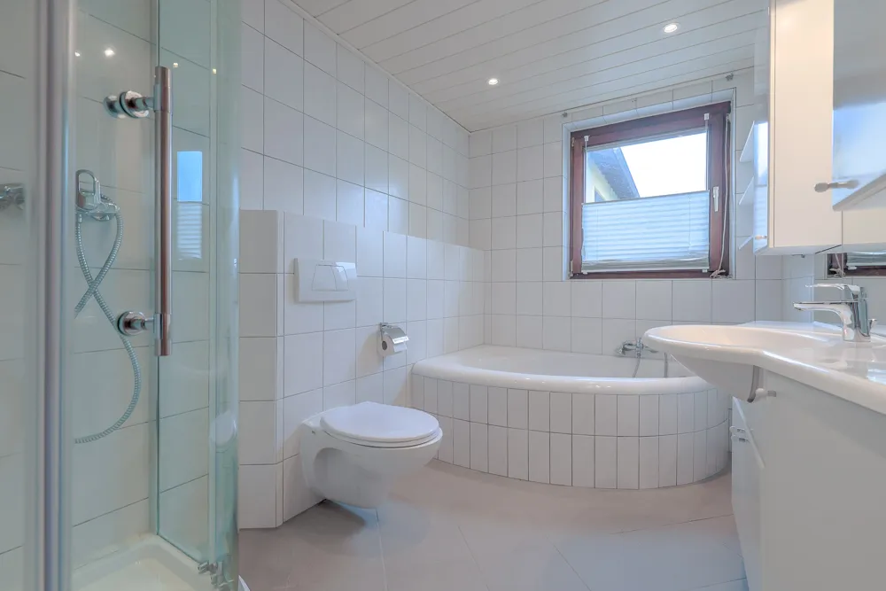 Im Obergeschoss befinden sich ein zentraler Flur, zwei Schlafzimmer sowie ein Badezimmer. Das Bad ist mit einer Eckbadewanne, einer Eckdusche, einem Waschbecken, einem WC, einem Handtuchheizkörper sowie einem Fenster ausgestattet. Im Flur sorgt eine Lichtkuppel in der Decke, die Tageslicht von oben einfallen lässt, für eine freundliche und helle Atmosphäre.