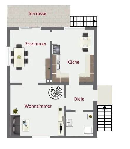 Im Obergeschoss gelangen Sie über eine Wendeltreppe aus dem Wohnzimmer. Diese Etage bietet ein geräumiges, lichtdurchflutetes Schlafzimmer sowie ein großzügiges Wannenbad mit Fenster. Die Diele im Obergeschoss ist ebenfalls geräumig und vielseitig nutzbar.