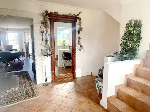 Bei Betreten des Hauses werden Sie von der großzügigen Eingangshalle empfangen, die Sie direkt in das Herzstück des Hauses führt - das Wohnzimmer. Hier erwartet Sie ein gemütlicher Kamin, der an kalten Winterabenden für wohlige Wärme sorgt.
