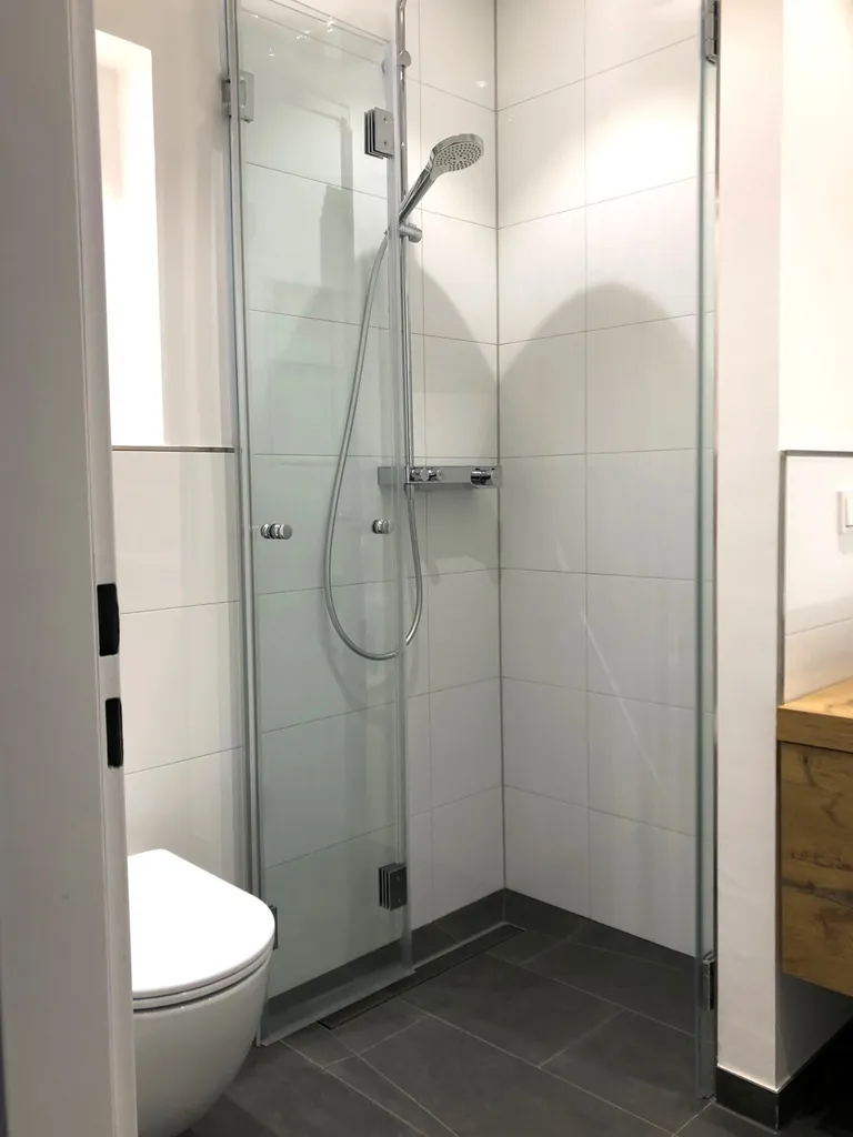 Das Badezimmer verfügt über eine Dusche, ein Waschbecken und ein WC. Helle, großformatige Fliesen sorgen für ein modernes Erscheinungsbild, ein Lüftungssystem unterstützt die Belüftung des Raumes.