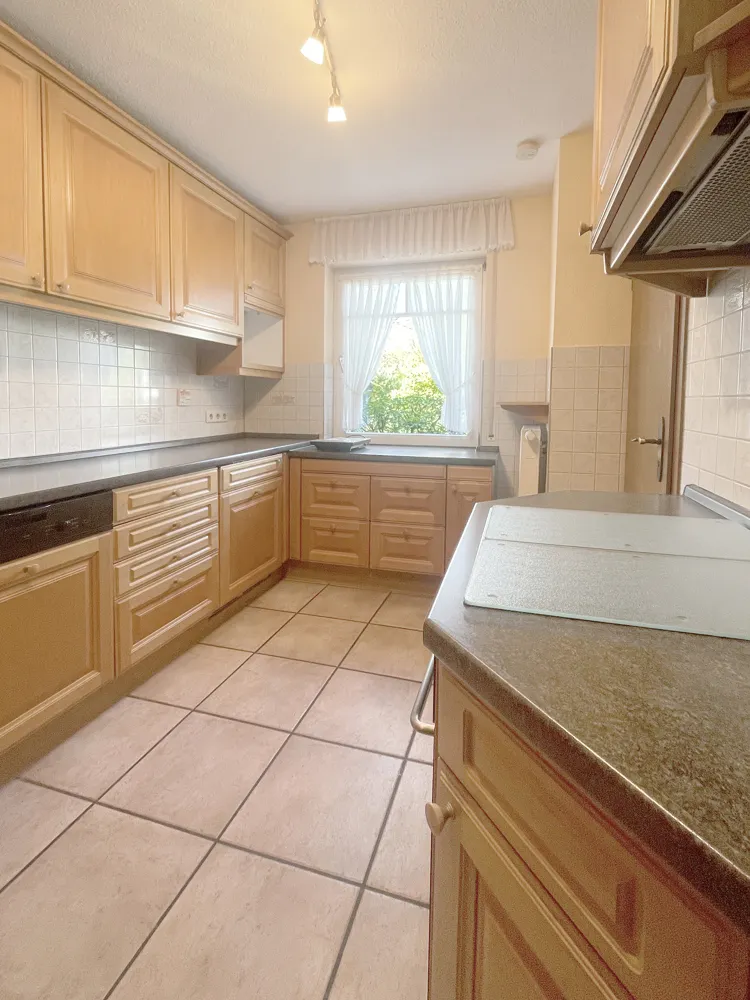 Die Küche ist eine klassische Arbeitsküche mit angrenzendem Vorratsraum, in dem sich die neue Gasheizung von 2018 befindet und das Tageslicht-Gäste-WC schliesst diese Etage ab.