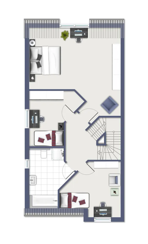 Auf Grund des ungewöhnlichen Schnittes und der Zimmeraufteilung passt es hervorragend, wenn Sie im Homeoffice tätig sind oder zu einer Familie mit einem Kind.