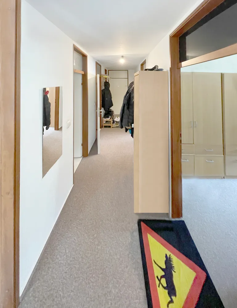 Alle Zimmer, bis auf das Kinderzimmer, haben Zugang zu den beiden Loggien die sowohl nach Osten als auch nach Süden ausgerichtet sind. Das grosse Schlafzimmer und das Kinderzimmer haben Morgensonne. Das ebenfalls grosse und geräumige Wohn-/ Esszimmer bietet viel Platz für Ihr Mobiliar. Sie können nach Herzenslust aussuchen wonach Ihnen gerade ist, ob Sie in der Morgensonne frühstücken oder in der Abendsonne den Abend ausklingen lassen. Die Küche ist eine klassische Arbeitsküche und der Abstellraum befindet sich neben dem Wohnungseingang. Zudem bietet der Flur, von dem aus Sie alle Räume betreten können, genug Platz für eine Garderobe.