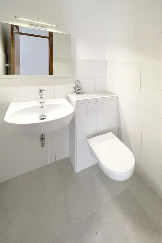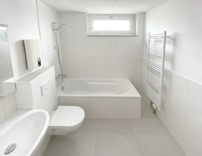 Das innenliegende Gäste-WC und Wannenbad mit Fenster sind mit hellen Fliesen versehen worden. Die beiden Schlafzimmer bieten genügend Platz für die Familie. Die Wohnung wurde 2023 komplett saniert, neues Bad und Gäste-WC und neuer Vinylboden ist verlegt worden. Die Bilder sind Archivbilder.