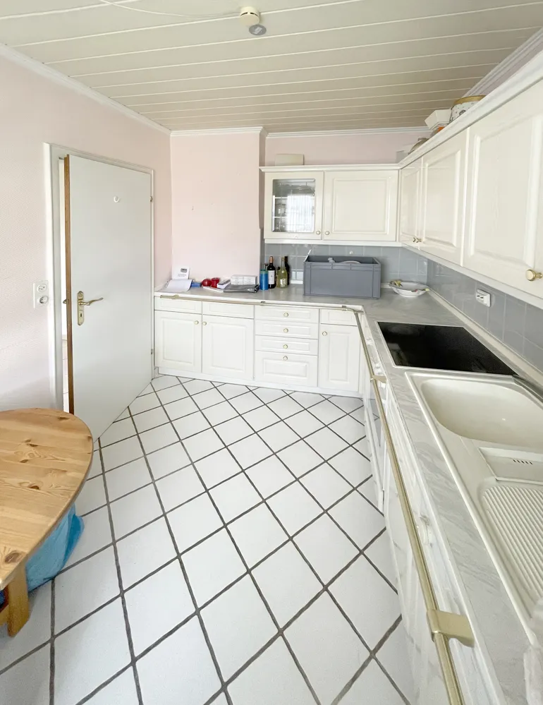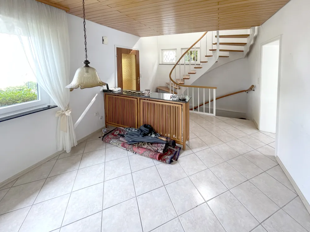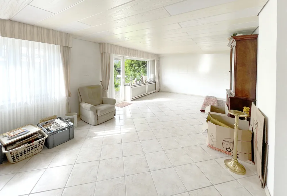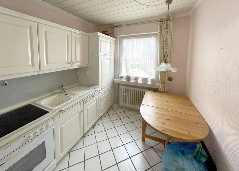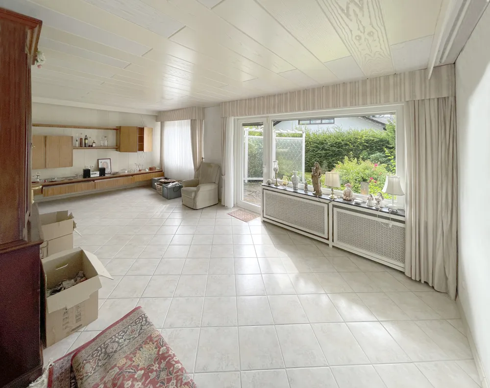 Vom kleinen Windfang aus gelangen Sie in einen sehr hellen Raum, der als Esszimmer genutzt wurde. Die offene Holztreppe sowie die einladenden Bunt-Bleiglasfenster verleihen diesem Raum seinen Charme. Angrenzend befindet sich die klassisch geräumige Arbeitsküche. Das Wohnzimmer mit ca. 30 m² Wohnfläche und den herrlichen Blick auf die Terrasse und den Garten lassen Ihren Gestaltungsmöglichkeiten viel Raum. Das komplette EG ist durchgehend gefliest und neben dem Windfang befindet sich noch ein kleines Gäste-WC mit einem ebenfalls runden Bunt-Bleiglasfenster.
