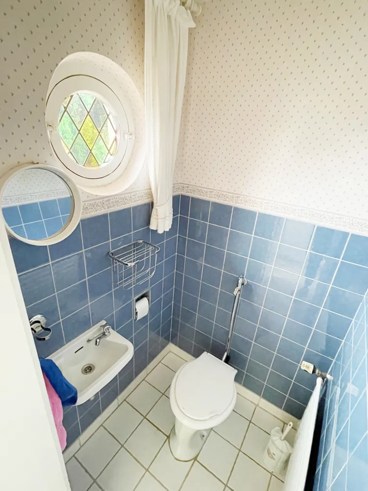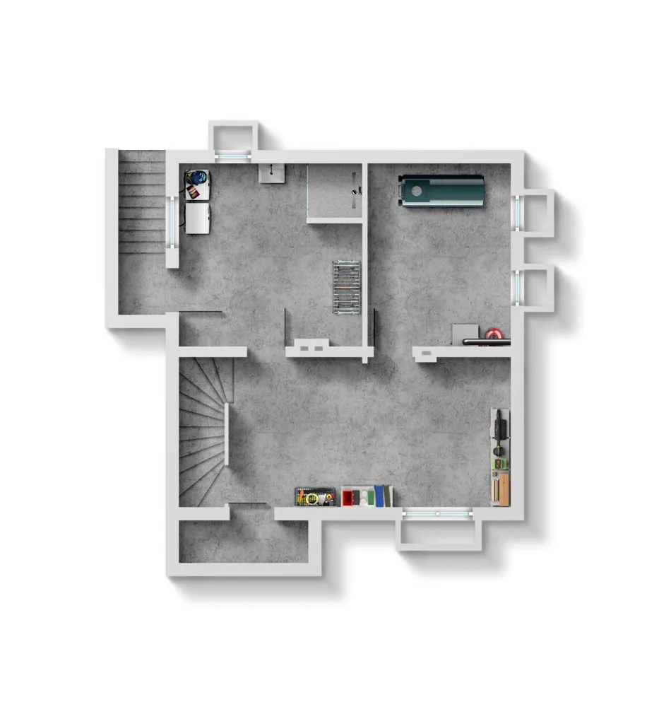 Das Haus ist voll unterkellert. Im hellen Waschkeller wurde eine weitere Dusche integriert und es gibt einen Aufgang in den Garten. Nebenan im Raum befindet sich die Ölheizung und der dazugehörige Tank. Der Hauptraum dienste der Geselligkeit mit einer kleinen Bar. Auch hier wurde geschickt Stauraum unter der Treppe geschaffen.