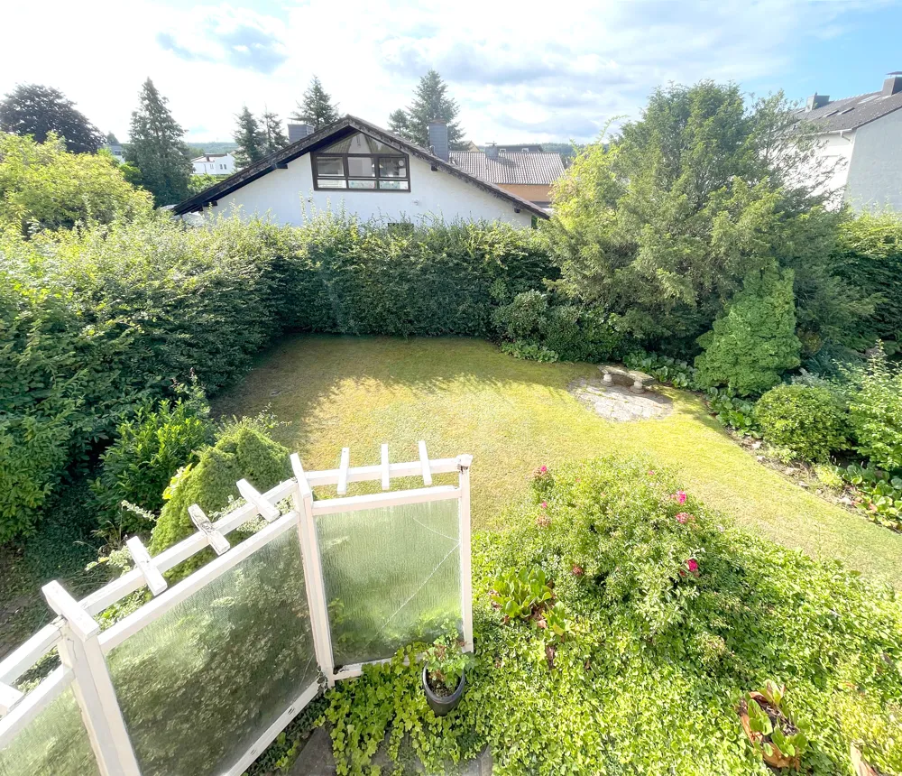 Das Haus ist umrundet von einem geschmackvoll angelegten Garten mit einem kleinen Teich. Überall können Sie sich Plätze, sonnig, oder schattig, zum Verweilen und Gartengenießen einrichten. Von der angehobenen, aufgeschütteten Terrasse aus haben Sie alles gut im Blick.