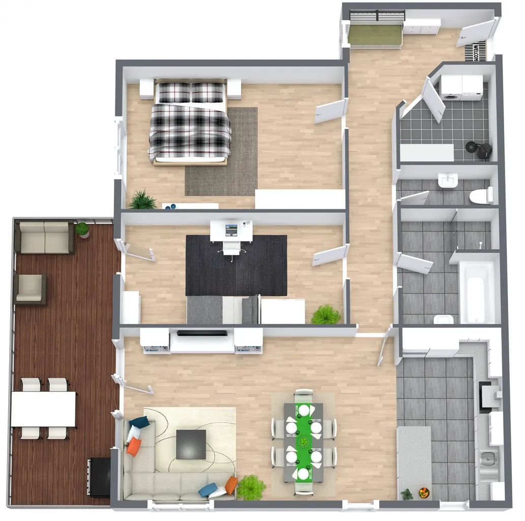 Das Badezimmer ist modern ausgestattet und bietet sowohl eine Dusche als auch eine Badewanne. Das Schlafzimmer bietet ausreichend Platz für ein Doppelbett sowie einen geräumigen Kleiderschrank. Das dritte Zimmer lässt sich vielseitig nutzen – ideal als Arbeits- oder Kinderzimmer.