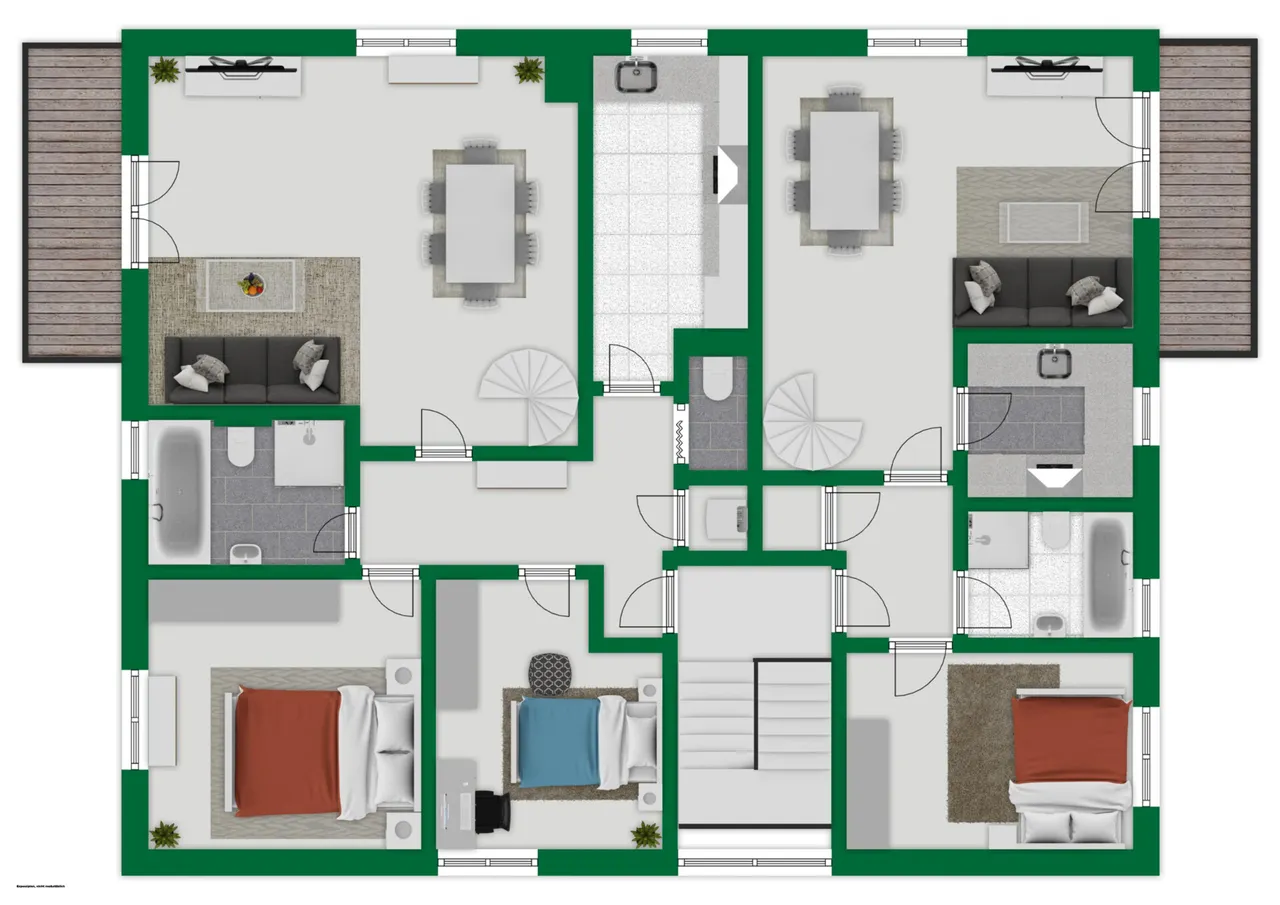 Die vier Wohnungen verfügen jeweils über drei bis vier Zimmer und sind mit Balkonen oder Terrassen ausgestattet, was den Wohnkomfort deutlich erhöht. Die funktionale Aufteilung der Einheiten trennt Wohn- und Schlafbereiche sinnvoll voneinander und schafft damit vielseitige Nutzungsmöglichkeiten für Familien, Paare oder Einzelpersonen. Große Fensterflächen sorgen für eine angenehme Belichtung und ein freundliches Wohngefühl.