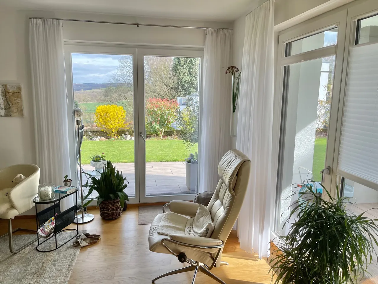 Diese moderne 3-Zimmer-Wohnung vereint großzügiges Wohnen, hochwertige Ausstattung und attraktive Außenflächen zu einem besonders komfortablen Zuhause. Herzstück der Wohnung ist das große, lichtdurchflutete Wohnzimmer, das viel Platz für einen Wohn- und Essbereich bietet und eine angenehme, offene Wohnatmosphäre schafft. Von hier aus gelangt man sowohl auf die Loggia als auch auf die Terrasse mit angrenzendem Garten.