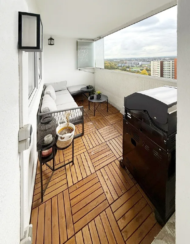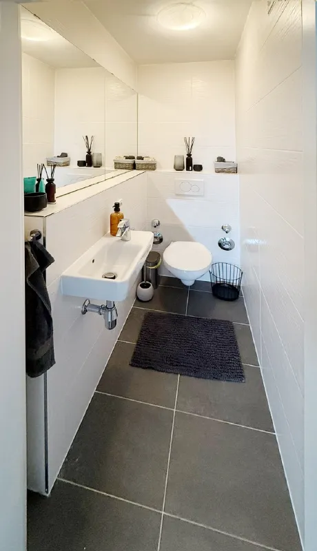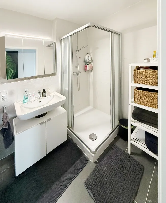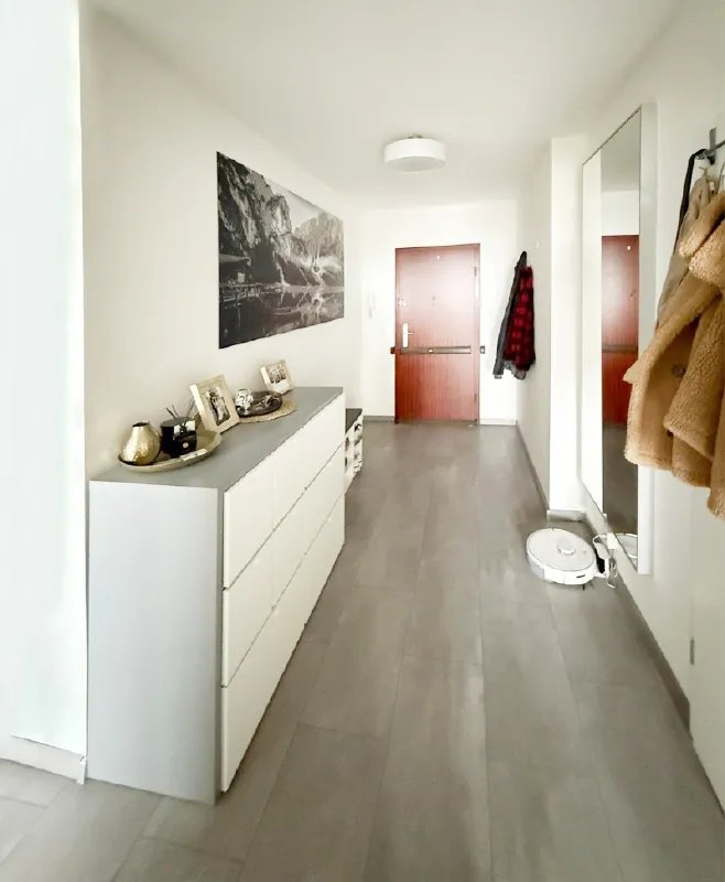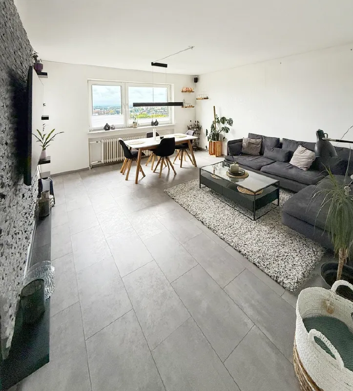 Helle, sehr freundliche Räume, klare Linien und die Betonoptik des Vinylfussbodens, der in der gesamten Wohnung verlegt wurde, unterstreichen den urbanen Wohnkomfort. Das grosse Wohn-/ Esszimmer bietet genug Platz für Geselligkeit und Ihr Mobiliar und hat den Zugang zur nach Süden ausgerichteten Loggia. Hier können Sie ganz entspannt und gechillt dem Sonnenuntergang folgen und an Regentagen die Glaselemente schliessen und sich trotzdem auf der Loggia aufhalten.