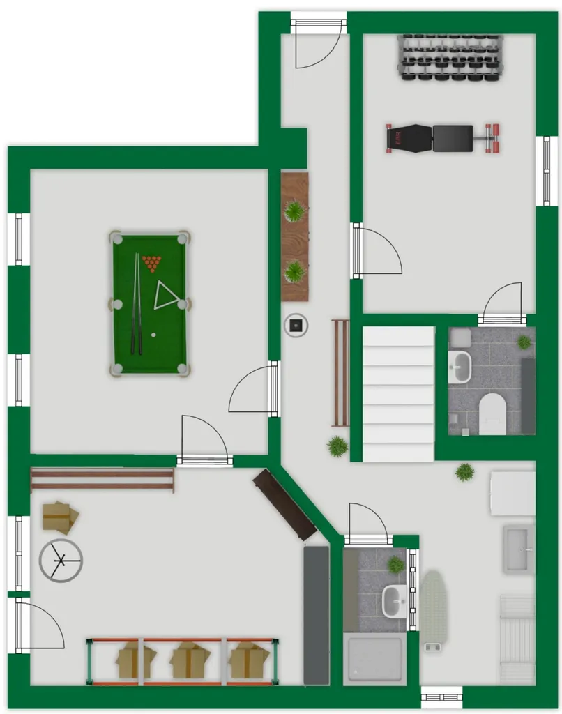 Das Untergeschoss verfügt über drei beheizte Hobbyräume, die vielseitig nutzbar sind – etwa als Gästezimmer, Büro, Werkstatt oder Fitnessbereich. Zudem stehen hier eine Waschküche, ein Badezimmer mit Dusche, ein separates WC sowie der Heizungskeller zur Verfügung.