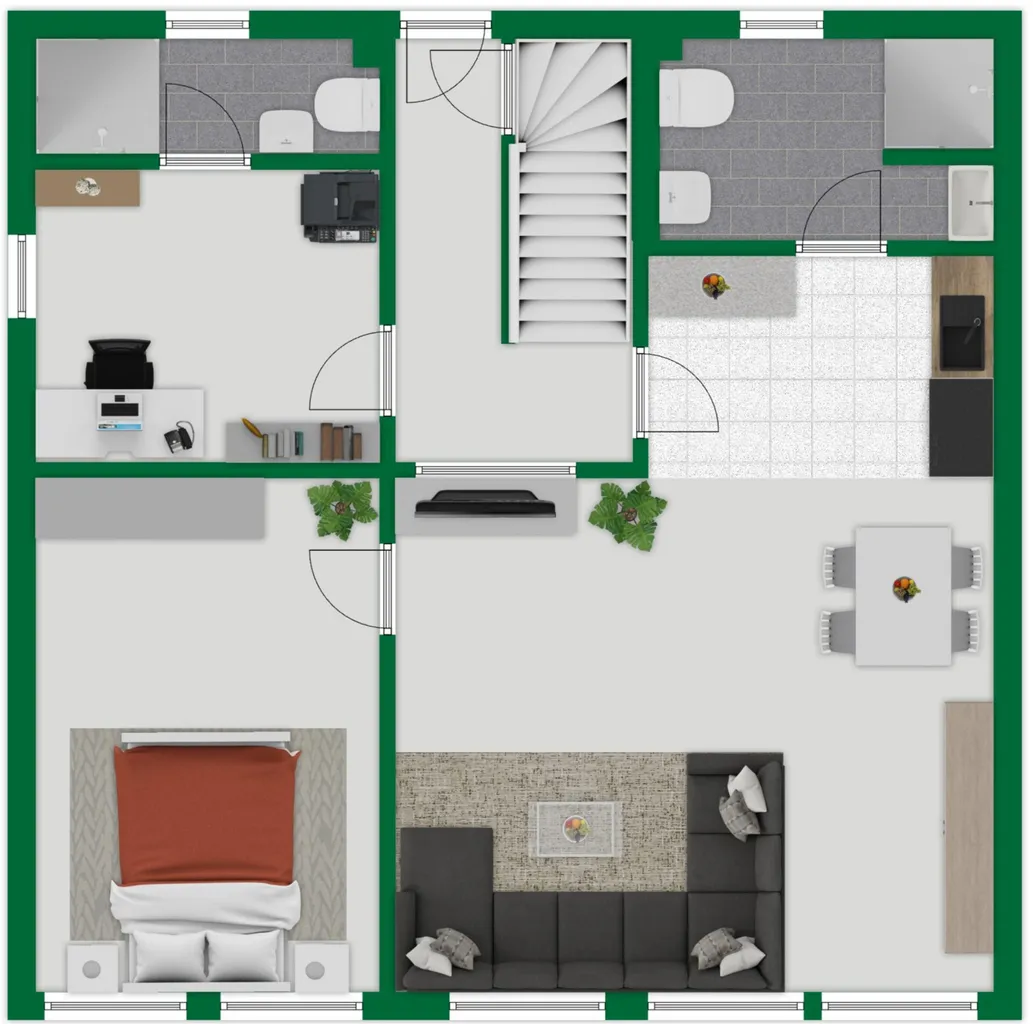 Die erste Einheit im Erdgeschoss ist eine charmante 2-Zimmer-Wohnung. Sie verfügt über einen Wohn- und Essbereich mit offener Küche sowie ein Schlafzimmer. Die Küche wurde frisch mit modernen Bodenfliesen ausgestattet.