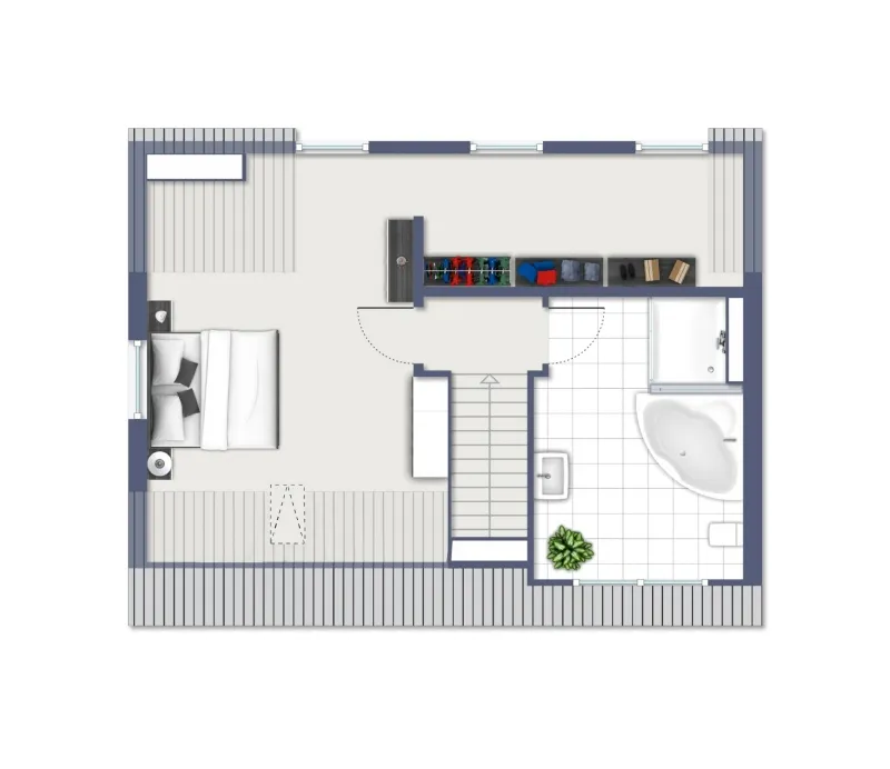 Das Obergeschoss bildet den klassischen Privatbereich, hier befindet sich das großzügige Schlafzimmer mit Ankleidebereich sowie das geräumige Tageslichtbad, welches mit Duscher und Badewanne ausgestattet ist.