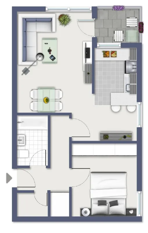 Auf ca. 61 m² Wohnfläche bietet diese Wohnung dem Bewohner alles was das Herz begehrt. Sie verteilen sich auf Wohn-/Essbereich mit halboffener Küche, Westbalkon, Schlafzimmer, Flur, Abstellraum und Duschbad. Aufgrund der Aufteilung eignet diese Wohnung sich sowohl für eine Einzelperson als auch für ein Paar. Sie betreten die Wohnung und erreichen den L-förmig verlaufenden Flur, welcher Sie jeden Raum der Wohnung erreichen lässt. Auf der linken Seite befindet sich das innenliegende Wannenbad, rechts der praktische Abstellraum. Vom Eingang direkt geradeaus liegt das geräumige Schlafzimmer, gehen Sie von hier aus im Flur links herum erreichen Sie das Wohnzimmer mit der halboffenen Küche.