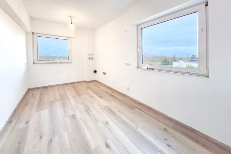 Der Westbalkon, welchen Sie über das Wohnzimmer erreichen, bietet Ihnen einen unschlagbaren Blick über die Felder in Richtung Rhein.