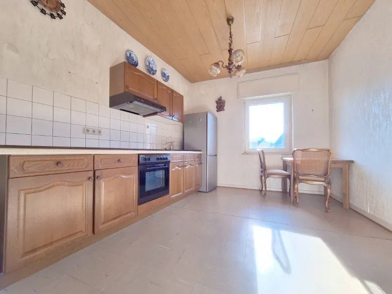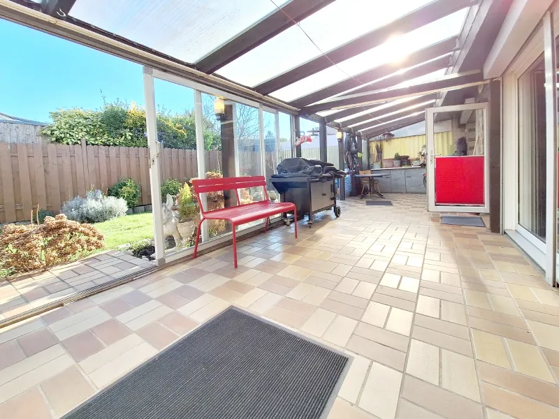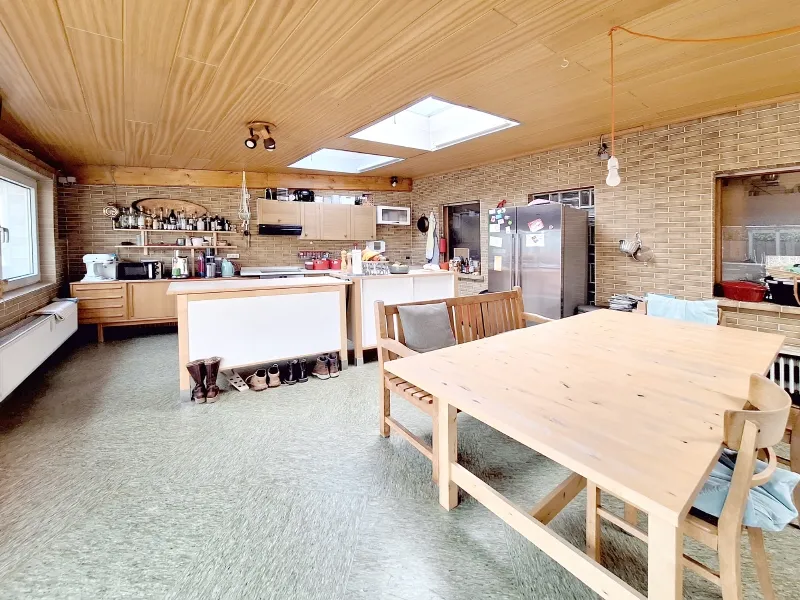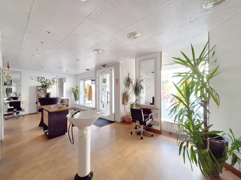 Der Friseursalon samt Nebenräumen umfasst ca. 69 m², diese verteilen sich auf das lichtdurchflutete Ladenlokal mit Kunden-WC, Teeküche, Büro und Vorbereitungsraum. Vom Büro aus haben Sie Zugang zur großen Wohnküche. Der als Wohnküche genutzte, geschlossene Wintergarten ist nicht zu Wohnzwecken genehmigt. Aus diesem Grund wird diese Fläche mit zur Nutzfläche gerechnet. Diese beträgt im Erdgeschoss ca. 48 m². Über die großzügigen Wohnküche erreichen Sie ein Tageslichtbad mit Dusche sowie die überdachte Terrasse sowie den Garten.