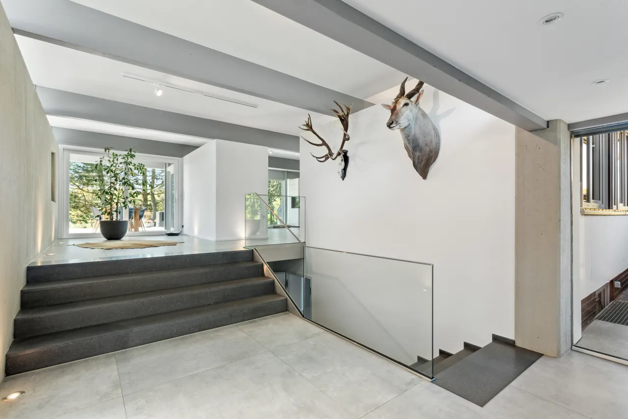 Dieses beeindruckende Architektenhaus wurde im Jahr 1971 in unverbaubarer Ortsrandlage erbaut. Das Haus besticht durch die beiden ineinander verschobenen Flachdachbaukörper, welche sich in die Topografie des Südgrundstückes optimal einfügen und einen freien Blick in die Landschaft ermöglichen. Bodentiefe Drei-Scheiben-Fenster- und Schiebetüranlagen, sowie die durchdachten Lichtbänder eröffnen aus den verschiedensten Blickwinkeln ständige Sicht ins Freie. Ein modernes Zuhause in hochwertigster Ausstattung, klassischem Design und einem durchdachten Raumkonzept.