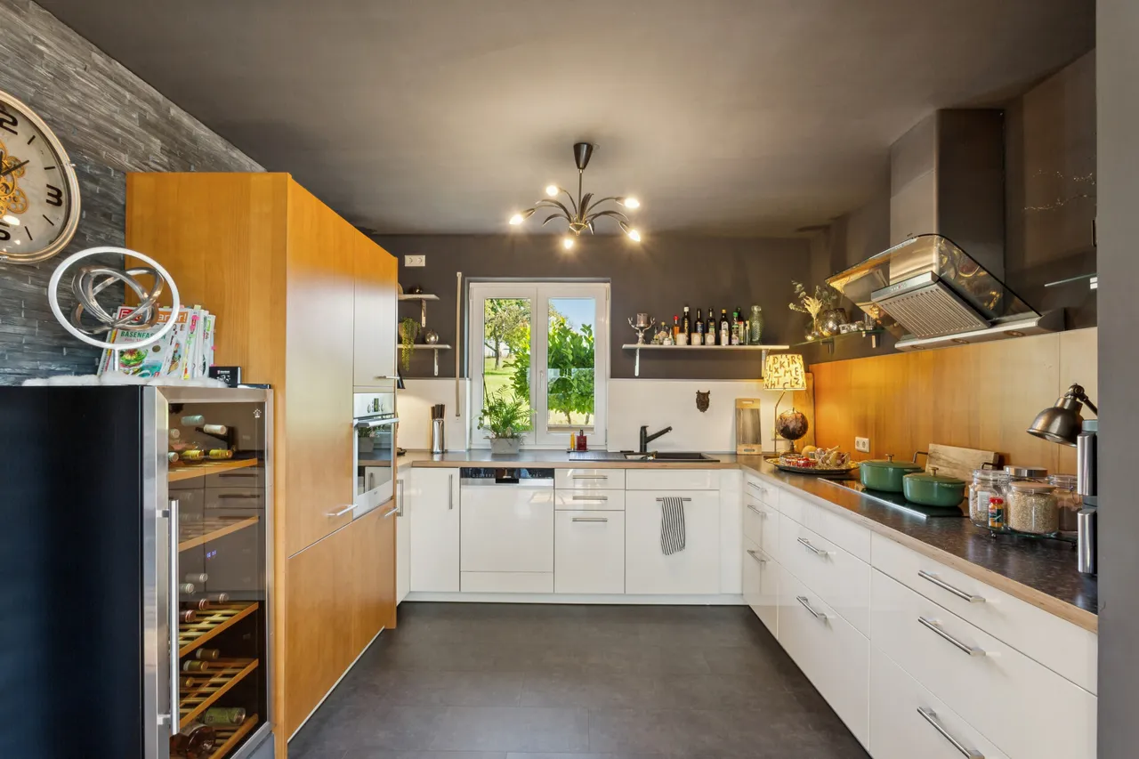 Die separat zugängliche Einliegerwohnung im Souterrain profitiert dank der Hanglage von bodentiefen Fenstern und einem direkten Zugang zur eigenen Terrasse. Sie verfügt über ein Schlafzimmer mit angrenzendem Ankleidezimmer, ein Badezimmer sowie einen offenen Wohnbereich mit integrierter Küche – ideal für Gäste, Familienmitglieder oder zur Vermietung.