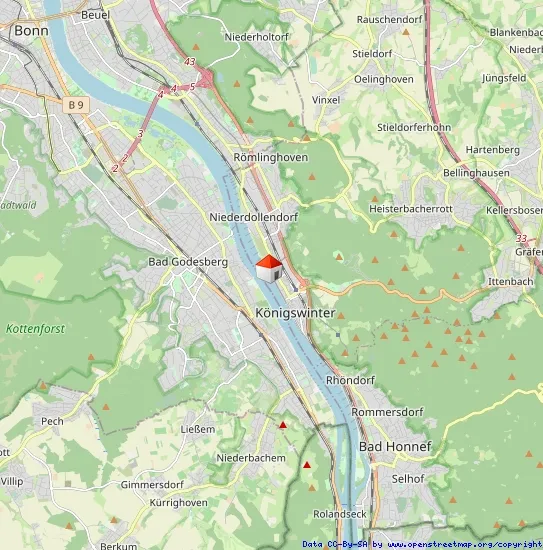 Die Umgebung ist geprägt von anspruchsvoller Architektur, hochwertigen Wohnanlagen und exklusiven Wohnstraßen. Einkaufsmöglichkeiten, Restaurants und Cafés sind bequem erreichbar, ohne die ruhige, naturnahe Atmosphäre zu beeinträchtigen. Zudem liegt die Wohnung in unmittelbarer Nähe zum Siebengebirge, das zu Wanderungen, Radtouren und Freizeitaktivitäten in der Natur einlädt. Die Kombination aus Rheinlage, urbaner Anbindung und naturnahem Umfeld macht die Adresse besonders attraktiv.